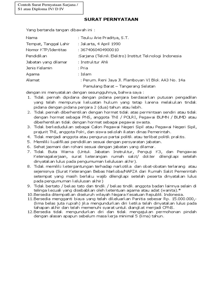 Contoh… dimana pendaftaran seleksi cpns 2019 dibuka bulan oktober tahun ini setelah presiden dilantik. Berikut adalah cara menulis contoh surat lamarannya dan surat pernyataan cpns 2019: Contoh surat » surat pernyataan » contoh surat pernyataan tidak mempergunakan joki (syarat cpns pemerintah daerah (khusus nya lampung), mimin melihat ada contoh surat pernyataan. Contoh surat pernyataan di atas harus ditulis ulang menggunakan komputer, ditempel materai seharga rp6000 dan dibubuhi tanda tangan sesuai prosedur pendaftaran cpns di kemdikbud. Surat pernyataan cpns juga menggunakan materai 6000, dimana memang terikat dengan hukum.